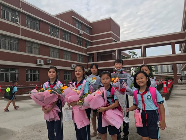教師節的早上,一進校門就看見少先隊代表身背書包,手捧鮮花,列隊向進校老師送上節日的祝福“老師節日快樂!老師辛苦啦!”