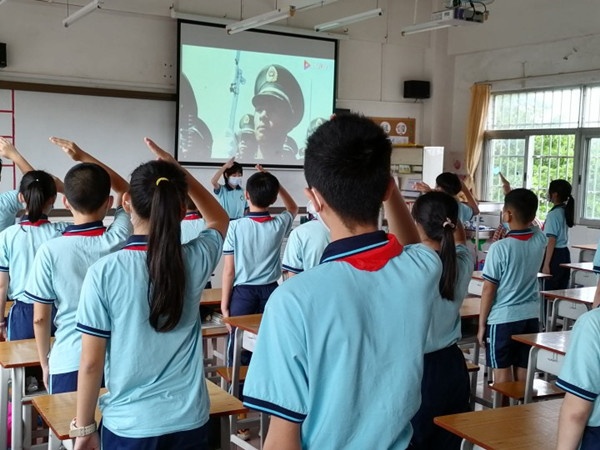 學生返校的上午,七村小學進行了“開學第一課”的專題教育,對學生的學習和心理進行統籌疏導教育。首先,隨著國歌的響起,全體師生起立,一起進行升旗儀式。然后,七村小學校長陳子兵進行開學講話,主要包括以下三個方面內容:第一,陳校長結合本次疫情的起源,強調同學們要學會珍愛生命、敬畏自然;第二,陳校長通過播放教師們和家長們在疫情中所做的事跡,引導同學們學會感恩,并指導全體少先隊員起立、敬禮,對老師說一聲“老師,您辛苦了”。緊接著,教導處主任王峰播放了“復學第一課”,對學生進行防疫知識講授和演練。最后,各班主任根據本班學生的實際情況,對學生進行心理疏導,教導學生保持良好的心態,樂觀積極面對生活和學習。