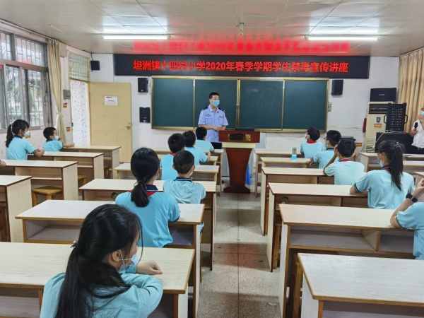 為進一步提高和鞏固學生們的安全意識、法制意識,5月18日,是新學期返校復課的第一天,坦洲鎮十四村小學以電教室為主會場,各班教室為分會場,召開了2020年春季學生法制安全教育講座。本次講座由學校法制副校長郭有勝警官主講。