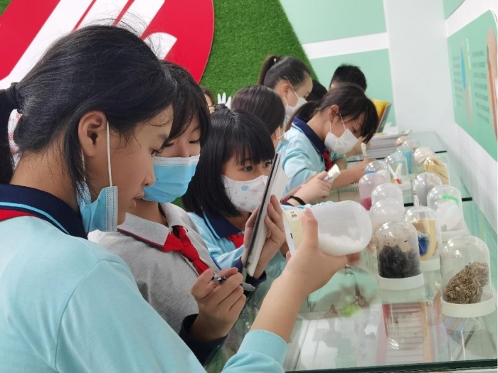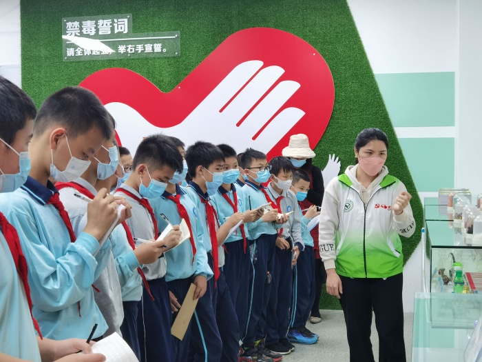 活動過程中,社工姐姐一邊帶領同學們觀看宣傳展板,各類毒品模型、吸毒工具等,一邊詳細地向同學們講解禁毒基地內每個區域的禁毒知識。同時,還向同學們介紹毒品的種類,講解生活中毒品會以不同的方式、形態出現在我們身邊,普及毒品防范技巧,讓學生擦亮眼睛,認清毒品形態。