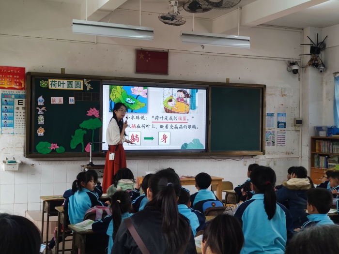 活動(dòng)第一環(huán)節(jié)由金斗灣小學(xué)余美卿老師執(zhí)教課例《荷葉圓圓》。課堂上,余老師深入文本,注重朗讀指導(dǎo),引導(dǎo)學(xué)生聯(lián)系生活,展開想象進(jìn)行個(gè)性化表達(dá),讓學(xué)生學(xué)有所思,學(xué)有所成。課后,參加活動(dòng)領(lǐng)導(dǎo)、老師結(jié)合本次的課例,對(duì)如何構(gòu)建語(yǔ)文高效課堂展開研討。楊興副局長(zhǎng)拋磚引玉,結(jié)合自身的學(xué)習(xí)經(jīng)歷,充分肯定了這節(jié)課的精彩之處,在于注重創(chuàng)設(shè)情境、朗讀的指導(dǎo)以及師生的感情互動(dòng),課堂氛圍輕松活潑,充滿童真童趣。其后,老師們各抒己見,紛紛對(duì)如何構(gòu)建語(yǔ)文高效課堂提出自己的見解,綻放出了群體智慧的光芒。陳麗娥副主任要求教師們要做好課堂常規(guī),積極鉆研反思,不斷提高自身專業(yè)水平,提高課堂效率。教研專干梁北橋老師指出,要構(gòu)建語(yǔ)文高效課堂,須用好教材,關(guān)注課文原文、閱讀提示和課后練習(xí),明確每課教學(xué)目標(biāo),落實(shí)課堂寫字的指導(dǎo)和訓(xùn)練。李偉老師則從心理學(xué)角度出發(fā),提出高效課堂要關(guān)注學(xué)生的最近發(fā)展區(qū),注重對(duì)學(xué)生的能力培養(yǎng)和情感培養(yǎng)。