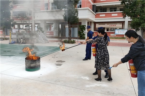 如果說學(xué)生的逃生演練較為稚嫩,那盧隊長的消防安全知識培訓(xùn)就顯得十分專業(yè)了。盧隊長首先點(diǎn)評了剛才的演練,表揚(yáng)了學(xué)生的逃生意識強(qiáng),撤離迅速有序,同時指出了其中的不足。隨后,盧隊長向全校師生普及了常見的消防知識,其中包括常見消防器材的使用和保養(yǎng),消防栓的使用方法,消防報警電話、報警的注意事項及自身著火的撲救方法等。接著,在確保安全的前提下,盧隊長現(xiàn)場演示了如何關(guān)掉燃燒的液化石油氣閥門以及常見滅火器的正確使用方法。當(dāng)學(xué)生看著熊熊燃燒的大火被滅火器瞬間撲滅,情不自禁地鼓起了熱烈的掌聲。盧隊長還熱情地邀請了學(xué)校的教師一起演練,讓大家也能熟練掌握滅火器正確的使用辦法,有備無患。