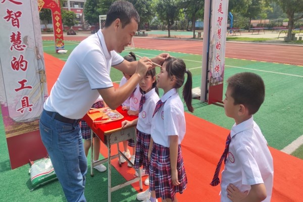 啟以開思,智以廣學。來到“啟智門”,校長和老師們為新生們“朱砂點痣”,開啟智慧。希望同學們在日后的學習中能目明心亮、一點就通。之后,在父母的陪伴下,新生們走過“知禮門”“守紀門”,意味著新生們要成為懂禮貌、守校紀的好學生。