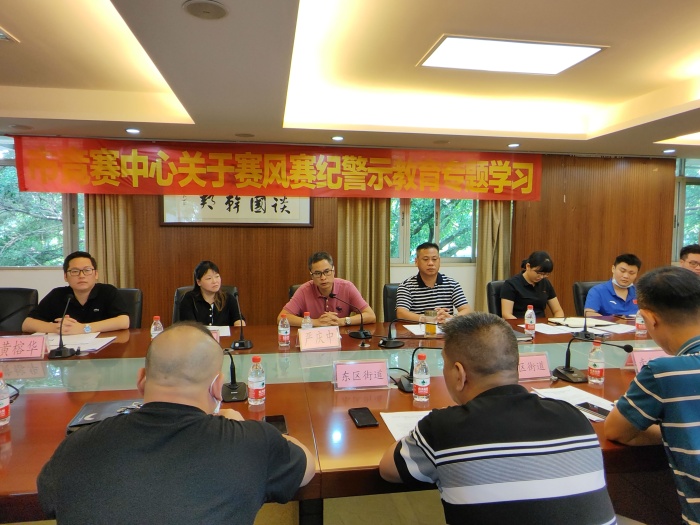 為響應國家、省、市關于嚴抓賽風賽紀警示教育學習的工作要求,9月15日,市競賽中心召開關于賽風賽紀警示教育專題學習交流會,會議邀請了市教育和體育局競技體育科嚴慶中科長和梁綺玲女士,以及部分鎮街體育專干、部分體育行業協會主管競賽和裁判員工作的負責人參加,市競賽中心全體工作人員出席會議。