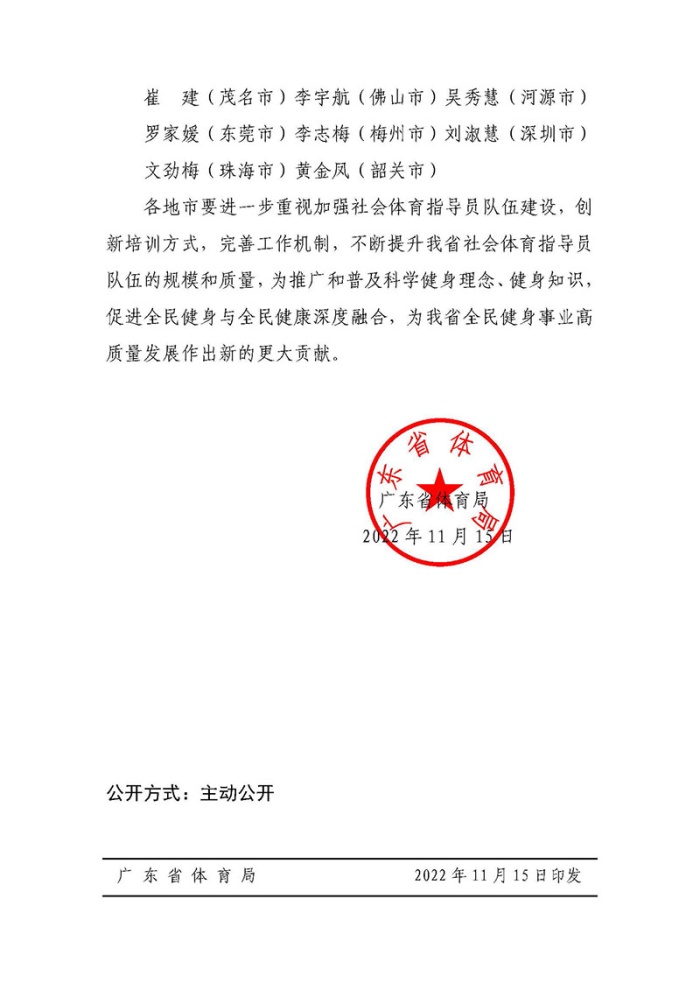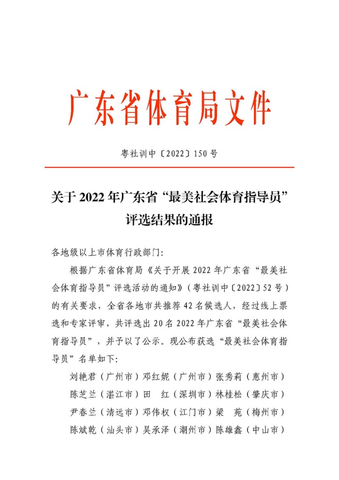 關于2022年廣東省“最美社會體育指導員”評選結果的通報