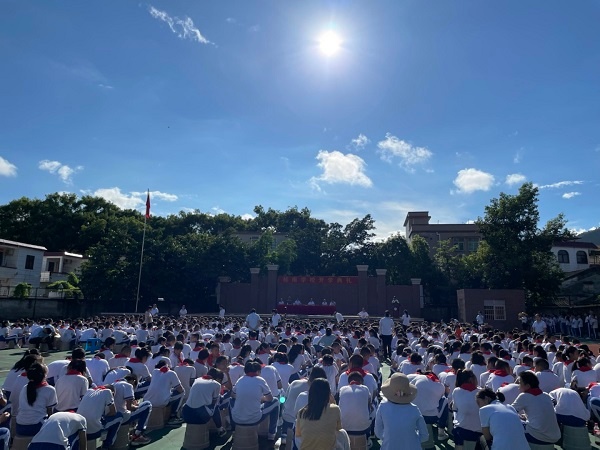 金風送爽,丹桂飄香,又是一個新學年的開始。2021年9月3日上午8:00,桂南學校小學部全體師生歡聚在學校運動場,舉行了秋季開學典禮。莊嚴的升旗儀式拉開了開學典禮的帷幕。雄壯的國歌響起,五星紅旗冉冉升起,全體師生面向國旗致敬。