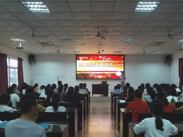 為加強教師隊伍建設,樹立教師形象,提高自身行為修養,弘揚新風正氣,2020年9月3日晚,桂南學校召開全校教師師德師風專題培訓會。本次會議由學校團委書記廖結芳主持,全體教師參加。