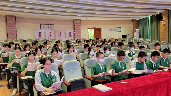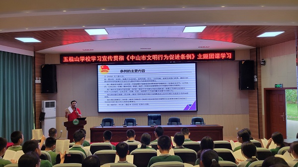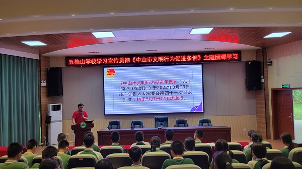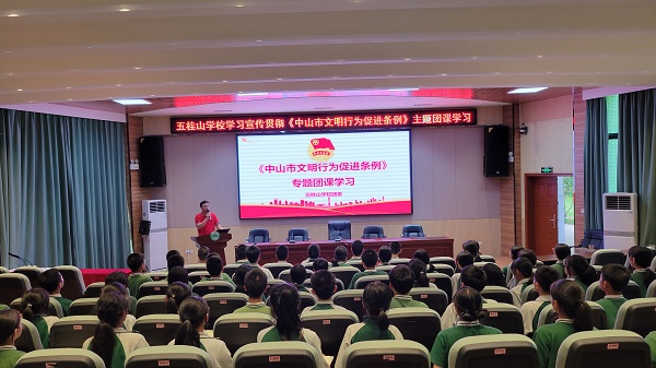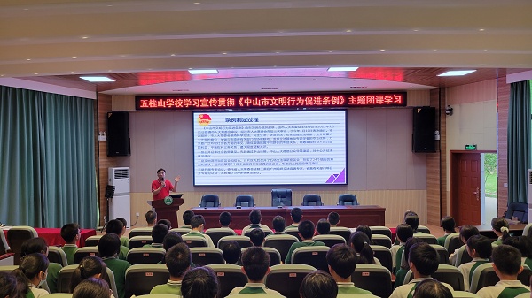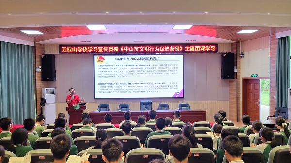 為學習宣傳和落實《中山市文明行為促進條例》實施方案,提升廣大青年學生的文明意識和文明素養,規范促進其文明行為,踐行社會主義核心價值觀,助力文明城市建設,2022年5月26日。五桂山學校團委在學校綜合報告廳開展了以“文明學習我帶頭 踐行新時代文明”為主題的《中山市文明行為促進條例》主題團課學習。團課學習由五桂山學校團委書記馮銳強主講,全體團員、團校學員、少先隊干部共70多人參加了本次學習。