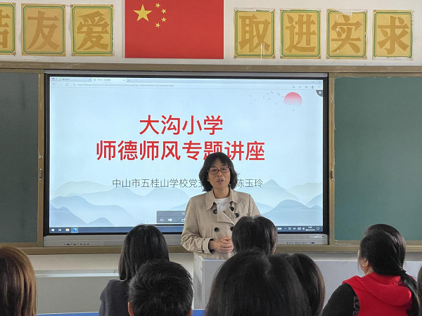 14日上午,送教教師與大溝小學行政齊聚會議室,陳玉玲校長結合學校的基本情況、辦學理念、辦學特色等與大溝小學行政領導進行辦學理念研討,并作以“師者,以德為先”為主題的師德師風專題講座。