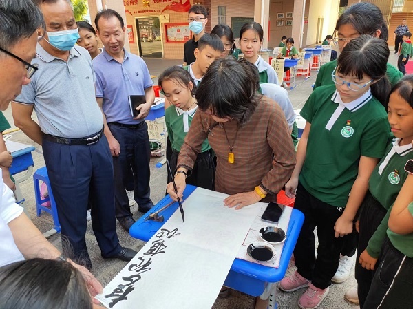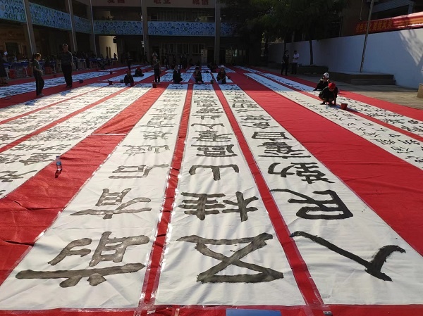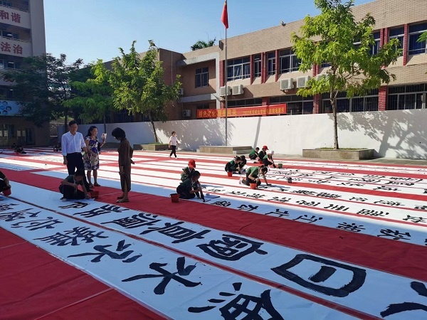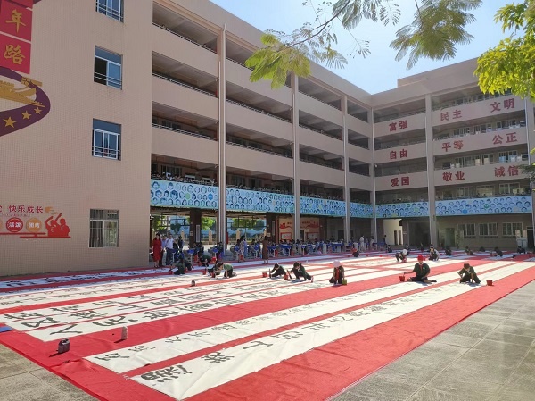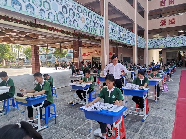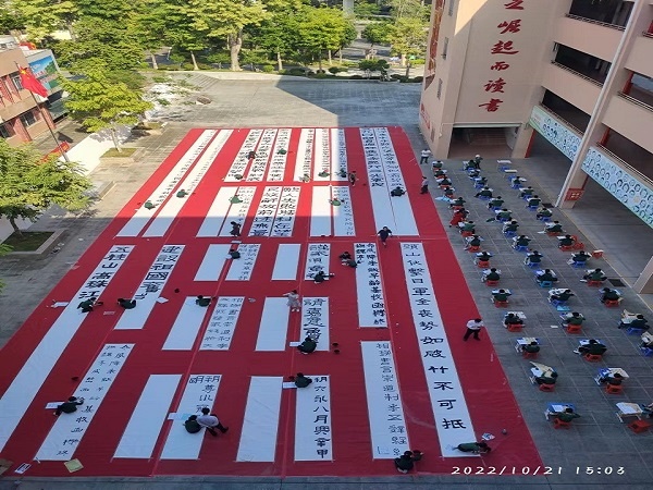 參加現場書法展示的為學校中小學書法社團成員,場地分為大字展示區和常規書寫展示區,場面蔚為壯觀。教學樓下630平方米的地面上鋪著紅毯,25名同學拿著大毛筆行走于白紙之間揮毫,進行書法創作。常規書寫展示區的44名同學滿懷激情,用心書寫每一個筆畫、每一個漢字,盡其所能展示自己的書寫水平。作品透著或規范、或嚴謹、或靈動的氣質。書寫內容基本選自紀念珠江縱隊成立五十周年專輯《五桂烽火》中的詩句。詩句激勵著五桂學子書英烈、學英雄。活動中,陳玉玲副校長為大家現場展示書法,鼓勵鞭策在場的同學們寫好中國字,做好中國人。整個活動,同學們認真品味著書法的藝術魅力,飽蘸濃墨、激揚文字。“書道雖深,志誠可達”,同學們全神貫注,將身心融于筆端,揮灑書寫之豪氣,一撇一捺,起轉鋒回,字字溢香。