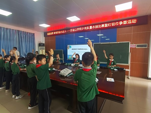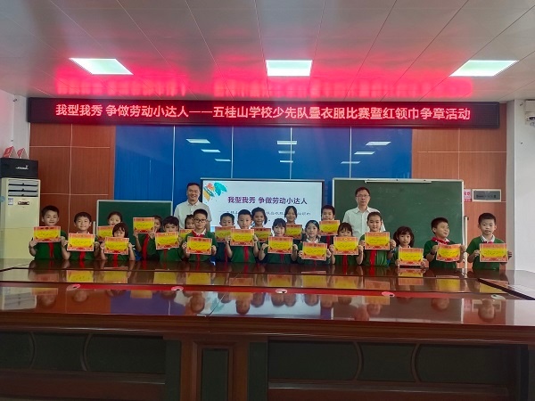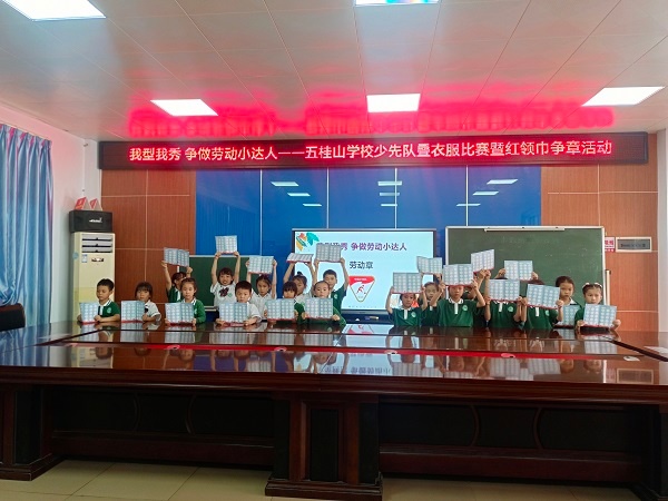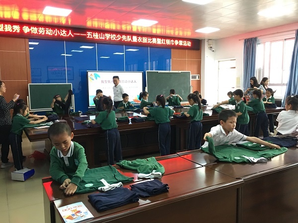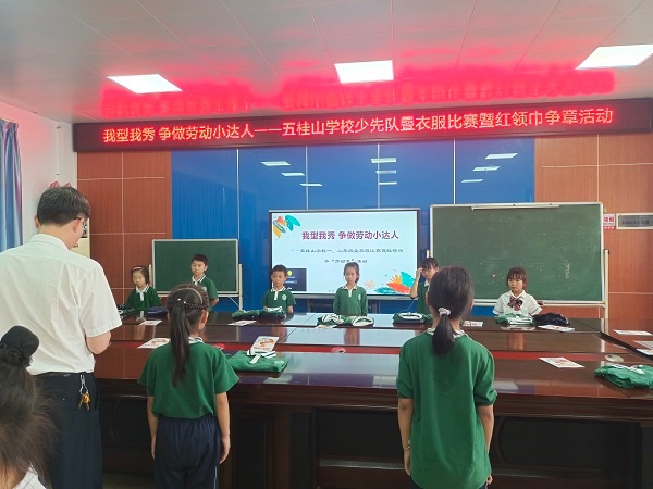 為進一步貫徹落實《關于全面加強新時代大中小學勞動教育的意見》文件精神,加強新時代勞動教育,指引學生樹立正確的勞動觀,提高學生的勞動技能,2023年5月5日,少先隊中山市五桂山學校大隊委組織開展了疊衣服比賽暨紅領巾勞動章爭章活動。本次疊衣服比賽,一二年級10個中隊分別選派4名選手參賽。活動由少先隊大隊輔導員姚敏鳳老師主持,德育主任、年級組長擔任評委。