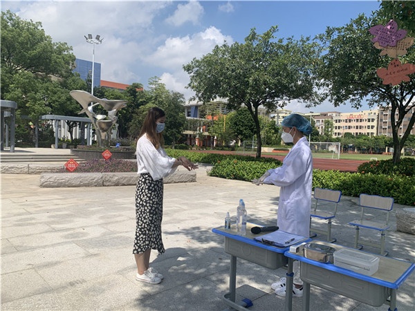 上午10:30,演練開始。學校對疫情防控十分重視,此次演練組織有序、流程清晰,通過模擬學生返校體溫篩查、上課突發情況處置、學生午餐、學生午休、學生放學、放學后消毒六個場景,展示開課后的校園疫情防控應急處理指引。演練從“學生”入校門等待區保持1米距離開始,進校時或在課室檢查發現體溫異常“學生”時,執勤、任課老師和校醫及時對該生進行體溫檢測、記錄、報告……各環節扎實到位,達到演練的預期效果。
