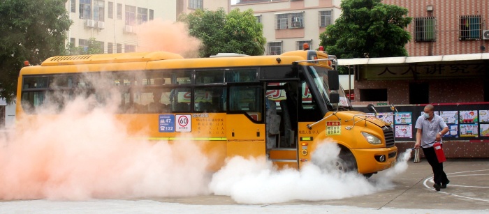 9時30分,鄧永飛副主任宣布演練開始,在全體與會人員的注視下,一輛校車緩緩行駛過來,突然冒出濃煙,校車發生了自燃。司機立刻緊急靠邊停車、打開車門,跟車老師立即站起來組織指揮學生快速有序下車,捂住口鼻分兩組分別從校車后門和前門有序到50米外的安全地帶集合;司機停穩車子后拿著三腳架警示牌跑到距離校車15米處放置,緊接著跑回車輛用滅火器快速滅火,然后撥打119報警。學生集合完畢,跟車老師用電話向學校領導報告。不一會,消防車輛趕到,參與對校車的救援滅火行動。整個演練過程迅速有序,師生動作熟練。