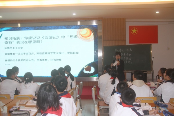 與會領導和教師首先開展聽課活動。小欖一中青年教師陳蕾以《想象:換一種眼光看世界——統編版七年級上冊第六單元整體教學設計》為內容,通過課堂學習,讓學生理解和把握課本單元中“想象”的特點和內涵,感受優秀想象作品的奇思妙想,進而發展創造性思維,運用所學知識創作想象類作品,為大家呈現了一節精彩生動的公開課。