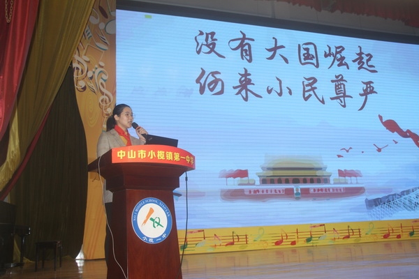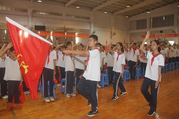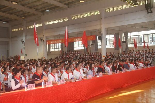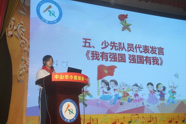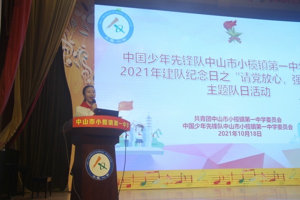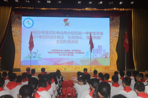 為慶祝中國少年先鋒隊建隊72周年,2021年10月18日,小欖鎮第一中學組織全體少先隊員在體育館舉行了“請黨放心,強國有我”主題隊日活動。參加活動的領導嘉賓有:鎮團委書記李雯同志、干事李倩琳同志,教育和體育事務中心德育專干周淑萍同志,貴州省六盤水市六位跟崗學習校長,小欖一中黨支部書記和校長呂麟同志、副校長陳源斌同志、團委書記李江同志及部分行政和教師。學校少先大隊副輔導員李素娟老師主持活動。