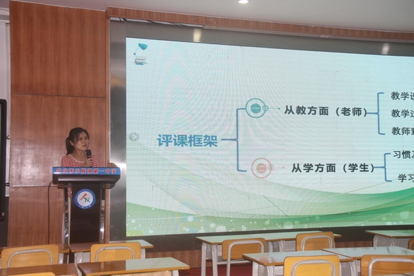 數學科組廖月紅老師根據評課框架,從老師教的方面,對該示范課的教學設計、教學過程、教師素養(yǎng)等進行了評議;也從學的方面,對學生的學習習慣及狀態(tài)、學習效果等進行了評議。