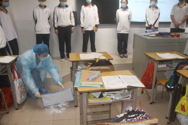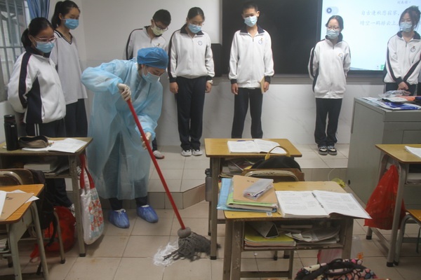 上課期間,一學生突然嘔吐。周圍學生立即自覺戴上口罩,在老師的組織下迅速、有序地轉移到備用教室。任課老師第一時間把情況匯報給校醫,把患病學生帶到隔離觀察室。校醫按要求迅速做好個人防護并到達教室現場,馬上在教室門口放置警示牌,打開一次性嘔吐腹瀉應急處置包,對嘔吐物進行專業消毒處理,做好記錄。校醫返回臨時隔離點,對嘔吐學生進行流行病史詢問,把情況匯報給學校主要負責人。班主任電話通知家長把學生帶去醫院就診。事后對教室進行消毒。