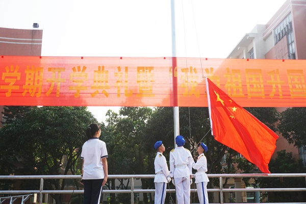 伴隨著莊嚴肅穆的升國旗儀式,開學典禮正式開始,鮮艷的五星紅旗迎著旭日,伴著晨風飄揚。