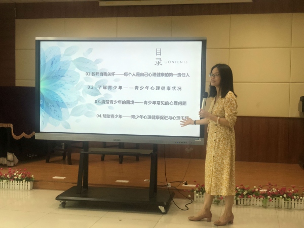 講座上,梁劍玲老師分別從“教師自我關懷”“了解青少年”“清楚青少年的困境”“幫助青少年”四個方面,以看圖片、講案例、小游戲、互動交流等多種方式教老師們如何判斷心理健康與異常、如何遵循個體心理發展規律施教、如何應對青少年心理健康問題等。講座貼近教師生活,案例生動形象、問題發人深省、講解深入淺出,不僅提高了教師們對心理健康及其意義的認識,還使老師們掌握了在繁忙的學習、工作、生活中基本的心理調試方法,更增強了教師對學生心理健康問題的促進與干預能力。