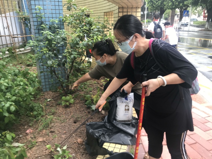 早晨7點30分,志愿者們就帶上掃帚、垃圾鏟、火鉗、手套等清潔工具回到學校,根據學校創文工作小組的規劃,分工合作,落實責任。中山一中西區中學范振海校長等行政帶領志愿者們對每一個區域進行排查,撿拾垃圾,清理雜物。從辦公室到大操場,從衛生間到飲水機,從校外人行道到周圍樓盤,每一個角落,都有志愿者擼起袖子加油干的身影。大家充分發揚不怕苦、不怕臟、不怕累的精神,仔細地清掃校園內外,不放過任何一處,讓衛生死角的垃圾、頑固塵埃、污漬無處藏身。