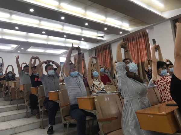 隨后趙博士現場教大家學習頸椎病預防保健操:左顧右盼、前后點頭、搖頭晃腦、旋肩舒頸、頭手相抗、毛巾抵抗、雙手托天理三焦,動作簡單易學,在趙博士帶領下,老師們認真學習,用心感受,會場里笑聲陣陣,經過模仿和實踐,老師們頓時感覺緊張酸痛的頸椎得到很好的緩解。