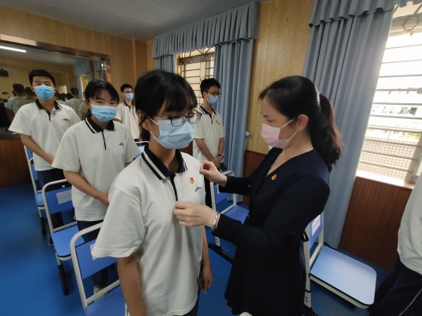 儀式開始,奏唱國歌。集體入團儀式嚴格按照標準化入團流程進行,全體新發(fā)展團員隔空共同唱響莊嚴國歌。隨后莫秀紅副校長宣讀新團員名單,此次入團80名同學(xué),他們是通過自主申報、資格審查、班主任推薦、學(xué)業(yè)成績考核、團校培訓(xùn)考核等綜合考察才獲準加入中國共產(chǎn)主義青年團的。接著,初三年級班主任、老團員為初三年級的新團員頒發(fā)團員證和佩戴團徽,初二年級的新團員由家長頒發(fā)和佩戴,全體團員線上同步面向團旗進行了莊嚴宣誓。