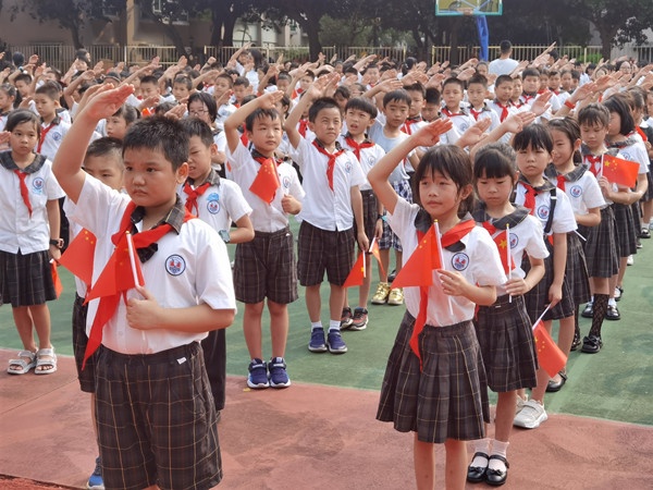 全校少先隊員齊唱《我和我的祖國》,并熱情地揮舞手中鮮紅的五星紅旗,表達自己對祖國母親的熱愛,傳遞出莘莘學子的愛國主義精神。在少先隊員們激情澎湃的歌聲中,一面面鮮紅的國旗隨風飄動,仿佛在向革命先輩們致敬……