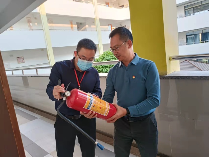 最后,黃督學和羅主任還巡查了校園,了解學校防疫安全、校舍設施安全、消防安全、食堂食品安全等情況。檢查過程中充分肯定了學校的常規管理扎實、校內環境整潔,廚房操作規范,消防定期檢查,門衛嚴格把關等,同時也提出了一些合理化的建議。
