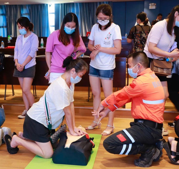 心肺復蘇是通過胸部外部壓力在胸部和內部之間形成壓力差,維持血液循環能力,并且在人工呼吸后向腦和心臟供應血液以維持生命,具體操作步驟為檢查傷病者的反應、高聲求助、打開氣道、檢查呼吸、施行胸部按壓、灌氣2次,再觀察心肺復蘇的有效指征。在場的家長志愿者認真聆聽,很多志愿者對體驗環節都是躍躍欲試。
