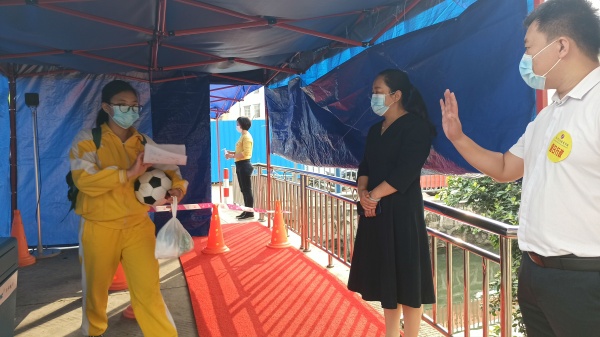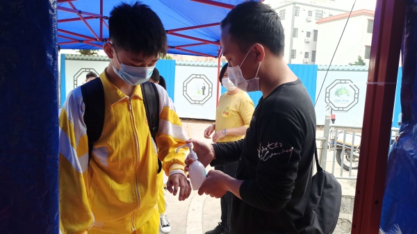 4月27日上午,聚星學校門口早已站著等待孩子們返校的班主任、老師。在聚星學校正門,孩子們根據老師的要求,有序地排成了間隔一米的隊形,經過紅外線測試儀體溫測試、消毒后進入校園。進入校園后,孩子們也不扎堆自覺單行、有條不紊按照要求排隊交健康卡、測量體溫、消毒、到洗手池洗手消毒,排隊上樓進入班級。為了學生進入校園時不產生扎堆的現象,聚星學校實行錯峰上學,讓同學們錯開班級、時間進入校園。