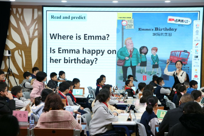 朱洛璇老師執教的課例是六年級英語《Emma’s birthday》。她的教學設計十分精彩,分為三大板塊,一是故事讀前激活,將學習內容和現實生活關聯促進學生對知識的深層理解;二是故事讀中交流,通過技術支持的課堂講授和多技術融合的教學方法和策略,讓學生充分參與課堂;三是故事讀后分享,學以致用。