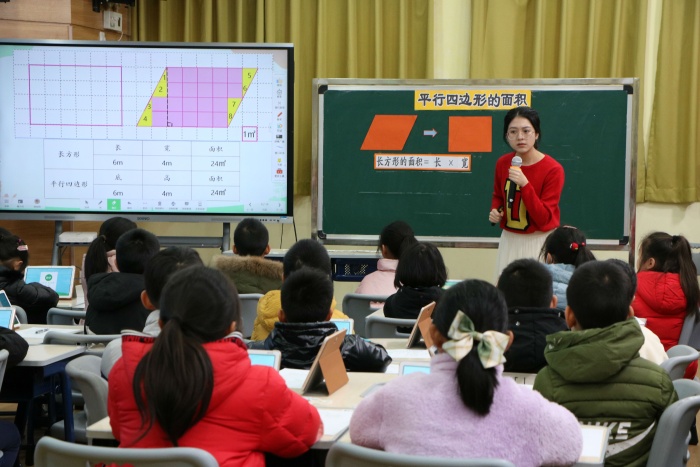 胡映月老師執教的課例是五年級數學《平行四邊形的面積》。胡老師把信息技術與學科深入融合,利用新媒體新技術的資源進行備課,運用了讀書郎智慧課堂平臺、UMU互動學習平臺、希沃白板5、短視頻等的信息技術,課堂上引導學生通過數方格及割補法進行探討,從而推導出面積公式,教學內容環環相扣,發現問題,導向解決問題。