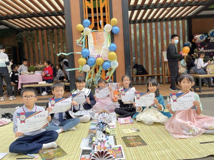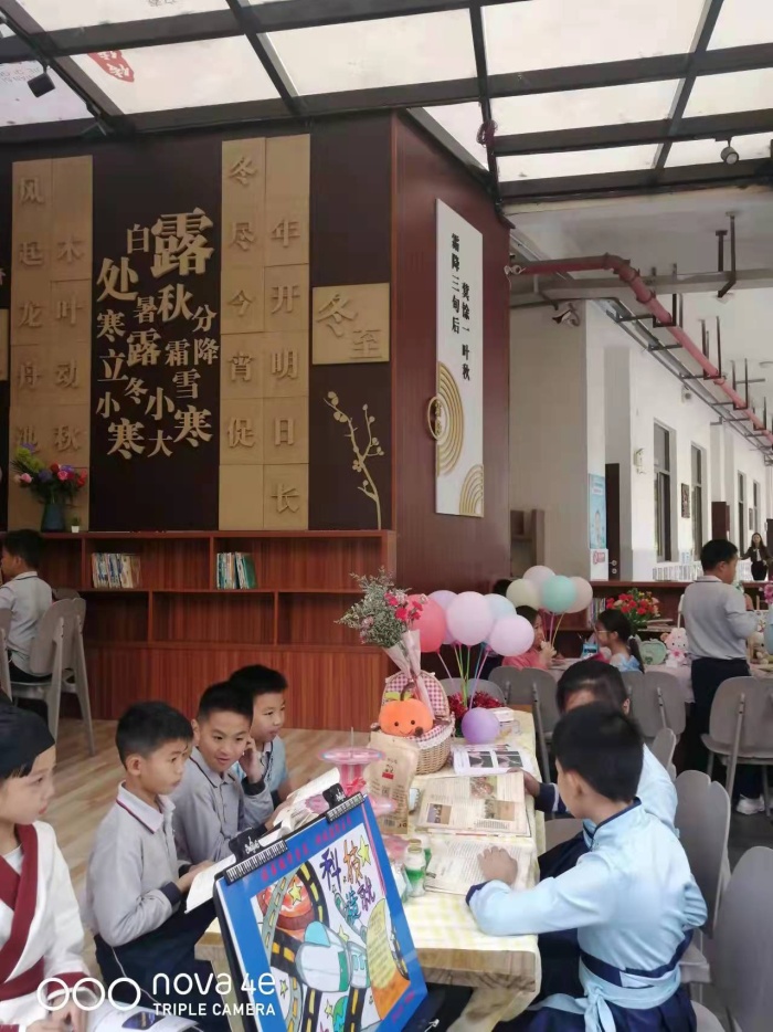 從閱讀護照的動態作業到閱讀活動的實境體驗,本次校園書會由校長贈書、校園一角書會、班級書會三個部分組成。在校園一角和室內等多個場地同步開展各班獨具特色的書會。戶外場包括詩書廊、星空廊、雅趣閣、閱讀館、風雨廊,分別由二年級4班、三年級1班、四年級8班、五年級3班以及六年級8班等負責。室內場在各班教室進行?;顒蝇F場,學生以小組為單位,布置閱讀場地,制作宣傳海報,撰寫廣告詞,準備推薦書籍,從下午2:30到4:00各項閱讀體驗活動紛紛開展,校園沉浸在閱讀與分享、朗讀與微表演、討論與思考中,書香亦是成長之馨香,鐵小時光里動人的一刻永遠留在每一個孩子心中。