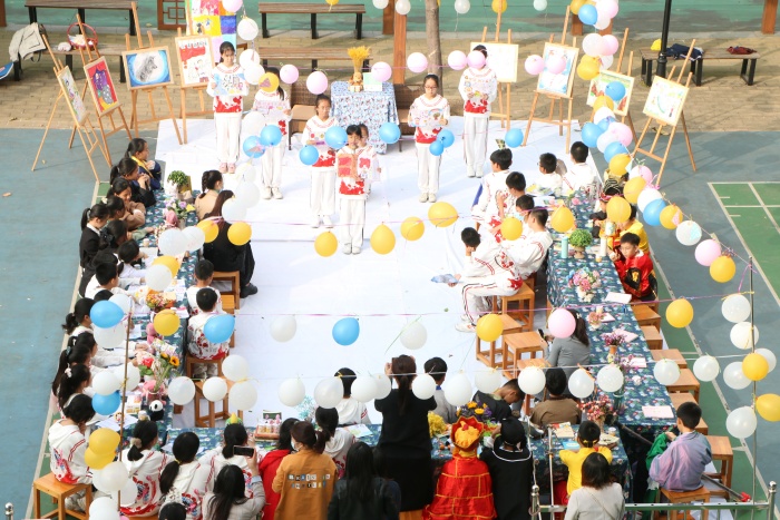 葛老師策劃的是一場課本劇表演,從道具的準備到腳本的撰寫,從排練到上場表演,她親歷了與孩子共同成長的每一寸時光。給力的家長團,將音響設備搬來現場,地毯要與班服顏色協調,氣球要隨風飄起來,桌子要鋪上漂亮的桌布,好書要分享得恰到好處,現場布置要由孩子們完成。老師的智慧與孩子的成長,家長的參與與孩子的交流,都在一本本書的閱讀推進中悄悄完成。(六8班語文老師葛陵帶領班級學生在鐵城小學厚德廊開展讀書會。)