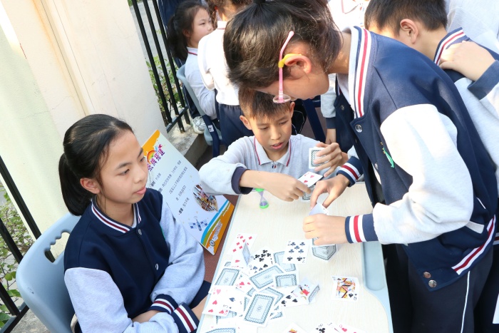 你看!活動場上,“紙牌搭建”攤位展示出了學生的智慧與速度,折、疊、套、搭,學生們在不斷的嘗試中尋找平衡,不僅搭高了紙牌,更搭建起屬于自己夢想的高樓;“磁鐵過隧道”攤位上,學生們的手指靈活配合著,他們操作著手中的磁鐵,探索著真理;“有孔紙托水”攤位上,學生們不斷在游戲中發現問題,利用學科知識解決問題,讓游戲也變得有趣……