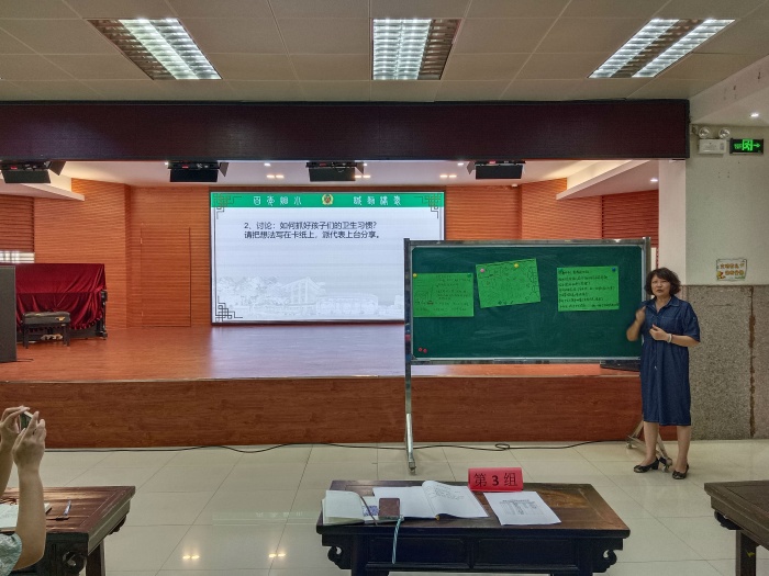 接著老師們就《如何抓好孩子們的衛生習慣》展開了分組討論,大家各抒己見,點子新穎接地氣。每個小組派一個代表上臺發言,有設置小組管理員的,有整理抽屜比賽的,有家校合作促發展的等等。