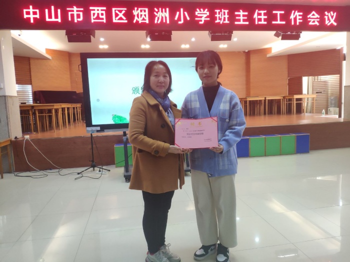 第一環節,工作室主持人對名班主任工作室助理劉斯琪老師頒發聘書,劉老師主要協助工作室主持人開展工作室的一系列活動。