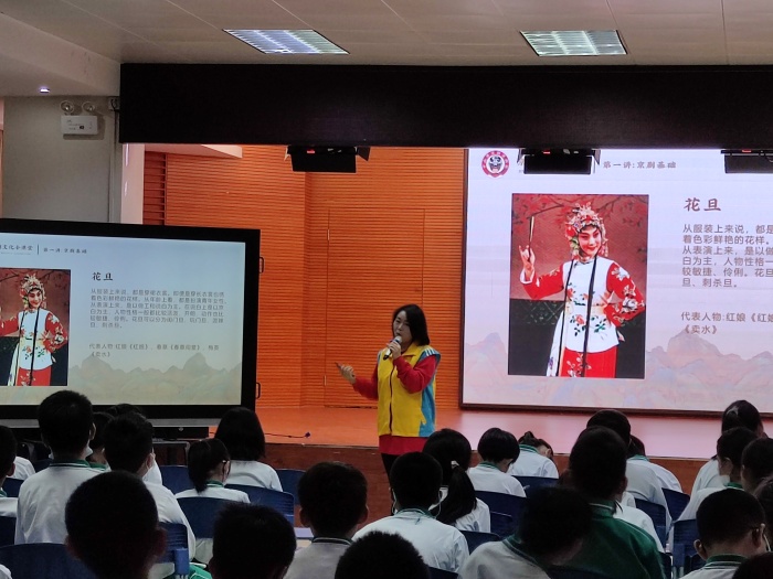 首先,由梁艷婷老師為學(xué)生們進(jìn)行了京劇知識(shí)普及講座,讓學(xué)生們初步了解京劇的形成與影響、京劇表演的特點(diǎn)等戲曲知識(shí),為同學(xué)們普及了京劇四大行當(dāng)——“生、旦、凈、丑”等京劇知識(shí)。梁老師還與同學(xué)們展開(kāi)了有趣的互動(dòng),以加深同學(xué)們對(duì)京劇這一劇種的理解,也讓同學(xué)們深刻體會(huì)到了京劇演員“臺(tái)上三分鐘,臺(tái)下十年功”的刻苦精神。