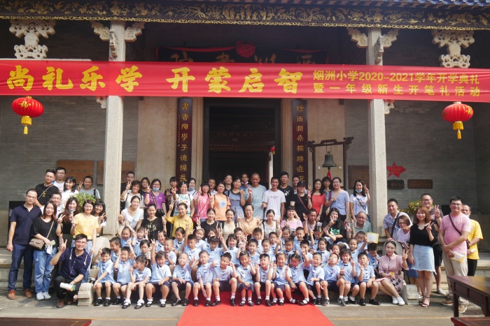 “開筆禮”活動在煙洲書院舉行,煙洲小學131名一年級新生及其家長參加了此項盛典。孩子們懷著無限的憧憬和期待,在老師們和家長們的引領下,在擁有147年歷史的煙洲書院中開啟了人生的新篇章。“開筆禮”在副校長楊志堅敲響的鐘聲中拉開了帷幕,活潑可愛的孩子們認真聆聽了校長黃文華的對他們的諄諄教誨,接著在悠揚的傳統音樂聲中,老師們為全體孩子“朱砂啟智”,寓意孩子們能夠開啟智慧,從此耳聰目明、心靈手巧。然后就是家長們認真地教孩子們書寫“人”字。以“人”開筆,寓意著孩子從小就要認識到學會做人的重要性,將來做一個頂天立地的人。“人”字寫好后,孩子們由家長領著緩緩走進莊嚴神圣的煙洲書院參拜萬世先師孔子。羅勇志老師帶領全體學生整理衣冠,誦《弟子規》(節選),三拜圣人孔子,三擊鼓明志,三位學生代表向老師敬茶,這些都寓意著學生們要尊師孝親、崇德立志、仁愛處世的中華傳統文化精髓,樹立“善 ” “正 ”行為規范,汲取尊師愛學的思想精華。最后,何彩云老師代表全體老師作了發言,表了決心。