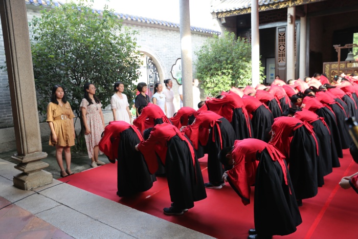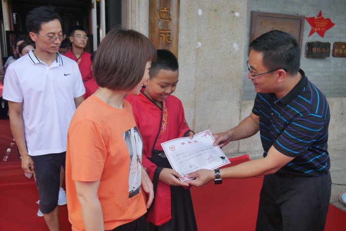 當(dāng)天下午4:30,在具有147年歷史的煙洲書院門前,98名小學(xué)畢業(yè)生身穿紅黑搭配的漢服,顯得特別有精神。今年的畢業(yè)禮打破以歌舞、相聲、小品等形式為主的畢業(yè)典禮模式,改為突出傳統(tǒng)“禮”的感恩儀式。活動先由黃文華校長致詞,他語重深長地說:“同學(xué)們,感恩會讓我們發(fā)現(xiàn)生命的富有和多彩,感恩會讓我們領(lǐng)悟生活的饋贈和恩典。讓我們心懷感恩,用愛回報身邊的每一個人……”校長意味深長、熱情洋溢的話語,激勵著在場的所有人。優(yōu)秀家長和優(yōu)秀學(xué)生代表分別致詞,他們發(fā)言完畢,六年級(1)班和六年級(2)班分別進(jìn)入書院中堂行“感恩之禮”。99名學(xué)生在羅勇志老師帶領(lǐng)下,一拜先師孔子,二拜父母,三拜恩師,誦讀了《弟子規(guī)》和《少年中國說》,場面莊嚴(yán)肅穆又高昂激蕩,感人至深,不少學(xué)生和家長悄悄流下了依依不舍的淚水。禮拜結(jié)束后,家長領(lǐng)著自己的孩子走出書院大門,就像他們6年前領(lǐng)著孩子進(jìn)入煙洲小學(xué)一樣,來到舞臺上接過校長頒發(fā)的畢業(yè)證書和紀(jì)念品,臉上洋溢著幸福的笑容。最后,孩子們通過一個詩歌朗誦的節(jié)目告別母校,并向國旗宣誓:我們將不負(fù)母校的期盼,不負(fù)恩師的厚望,全力以赴,再創(chuàng)輝煌!?