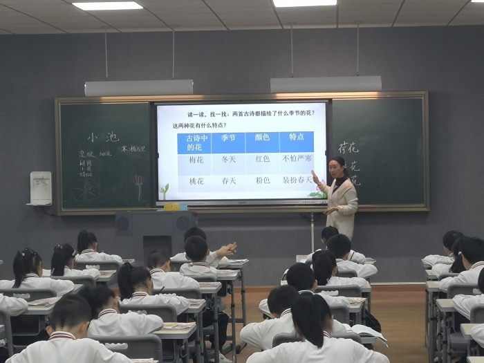 活動中,課題組成員周泉老師在西區中心小學廣豐校區一(2)班執教一節以《古詩中的花》為題的群詩閱讀教學課例。上課伊始,周老師帶領學生品析古詩《小池》,通過播放初夏小池圖片,詩的韻味便悄然彌漫于整個課堂,彌漫于學生的心中。課中,教師以古詩小組活動為抓手,通過聲情并茂的描繪,播放多彩優美的圖畫,聲情并茂地朗讀,再現初夏小池的美景,借助課文插圖及多媒體課件的呈現,幫助學生理解詩句的意思,從而使其體會詩中美麗的自然景色并產生聯想,激發學生在多向互動的課堂氛圍中深入閱讀、感悟古詩。整節課把學生帶入古詩所描繪的意境中,學生在幽靜的“小池”美景中徜徉。最后,進行對比閱讀《梅花》《惠崇春江晚景》兩首古詩,學生完成群詩表格。一節課就像一首心靈流動的樂章,似一篇文心涌動的詩篇,引人入勝。