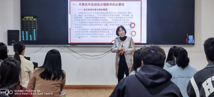 隨后,市級課題《小學(xué)低年段班級合唱教學(xué)實踐研究》主持人煙洲小學(xué)黃秋玲老師開展了題為《小學(xué)低年段班級合唱教學(xué)策略分析》的講座。黃老師通過分析《國務(wù)院辦公廳關(guān)于全面加強(qiáng)和改進(jìn)學(xué)校美育工作的意見》和《義務(wù)教育藝術(shù)課程標(biāo)準(zhǔn)(2022版)》指出在小學(xué)低年段開展合唱教學(xué)的必要性,結(jié)合中山市中小學(xué)生音樂能力底線標(biāo)準(zhǔn)的教學(xué)要求,提出在小學(xué)低年段開展班級合唱的教學(xué)策略:改編教材歌曲,讓合唱教學(xué)有米可炊;運用柯爾文手勢提高學(xué)生的音準(zhǔn)水平;運用節(jié)奏讀法培養(yǎng)學(xué)生的節(jié)奏感;運用豐富的形式訓(xùn)練學(xué)生的合唱能力;運用熟悉的歌曲進(jìn)行二聲部練習(xí)。黃老師在講座中特別強(qiáng)調(diào)在低年段實施班級合唱教學(xué)必須建立在準(zhǔn)確歌唱的基礎(chǔ)上。