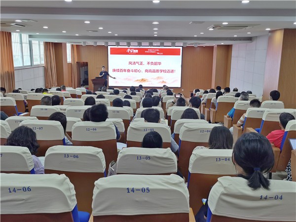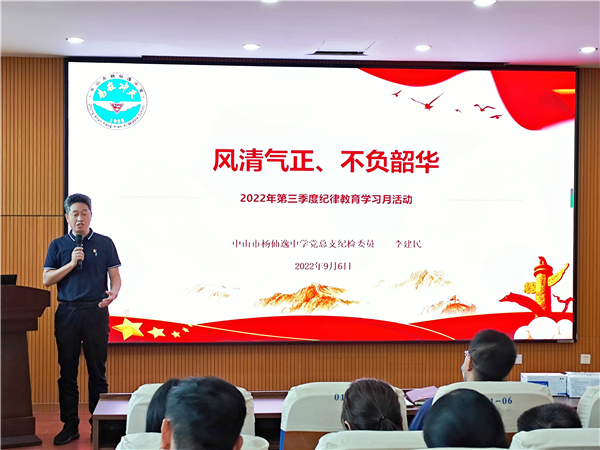 9月6日下午,中山市楊仙逸中學在綜合樓報告廳舉行了2022年第三季度紀律教育學習月活動,黨總支紀檢委員李建民做了“風清氣正、不負韶華”的專題講座,黨總支書記、校長劉朝暉主持專題警示教育,全體黨員和教職員工認真參加了學習活動。