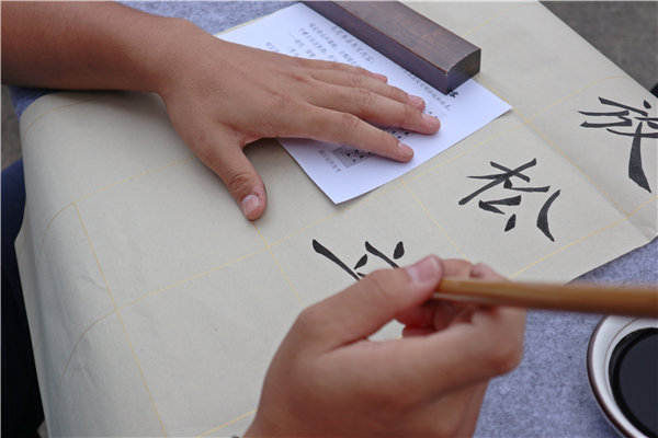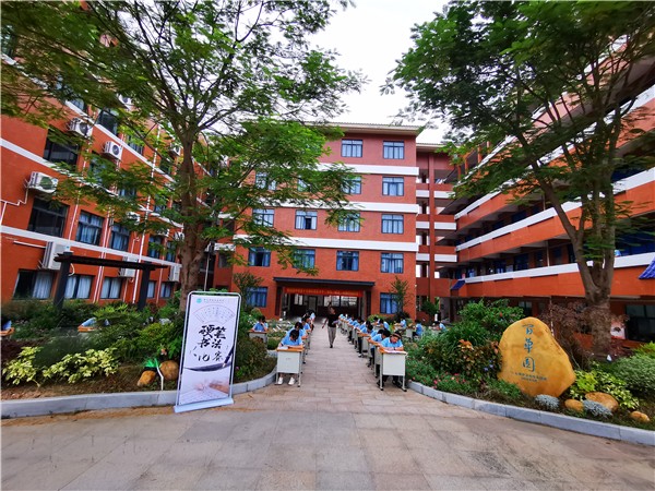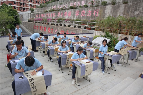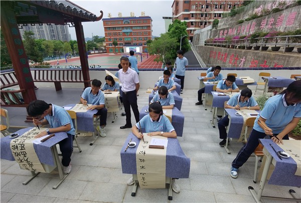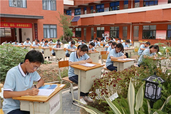 今年的書法比賽場地首次設(shè)在學(xué)校新增的兩個景觀點,毛筆書法是芳華亭,硬筆書法是百草園。草木掩映,流水淙淙,舒緩的音樂縈繞耳旁,書法比賽區(qū)一片寧靜悠揚,參賽者們靜心書寫,人文書香浸潤其中。