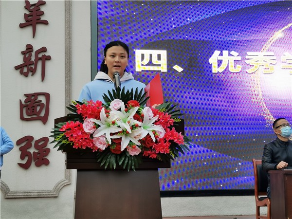 優秀學子代表張霜霜發表獲獎感言,感謝了江國良先生對優秀學子的褒獎。大家將帶著感恩之情,懷著對未來的美好期許,腳踏實地,奔向遠方,回饋母校、回報社會。她講到,善、雅、勤、新的校訓,將軍志在沖天的精神,時時激勵著同學們,以新仙中人之態鳴仙中之進步,以鏗鏘之勢發仙中之聲,為仙中發展添磚加瓦,努力成為仙中未來的榮光。