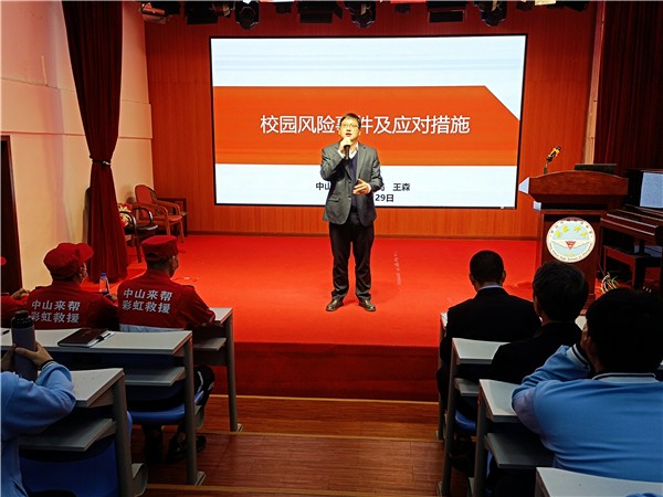 講座就校園風險事件之大類及其應對措施展開安全教育。王森主任將校園風險事件分為以下幾類:社會治安事件類、突發公共衛生事件類、事故災難類、自然災害類、影響學校安全與穩定的其他突發事件。