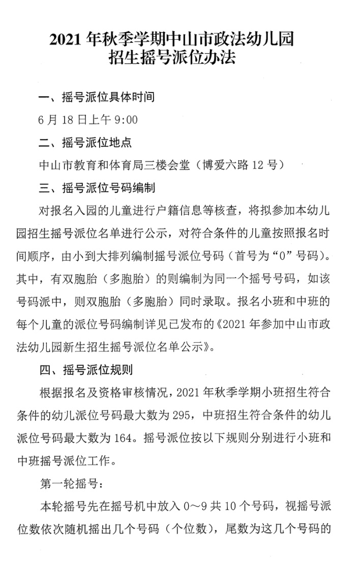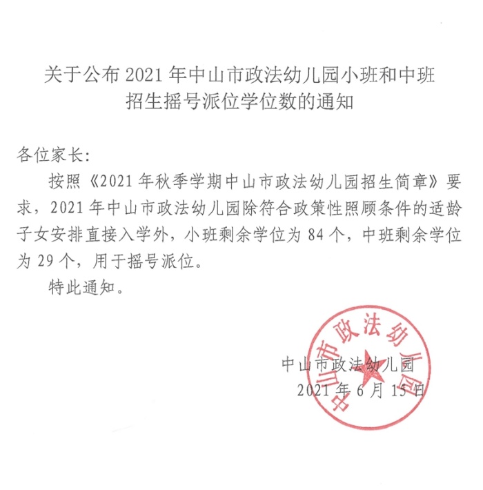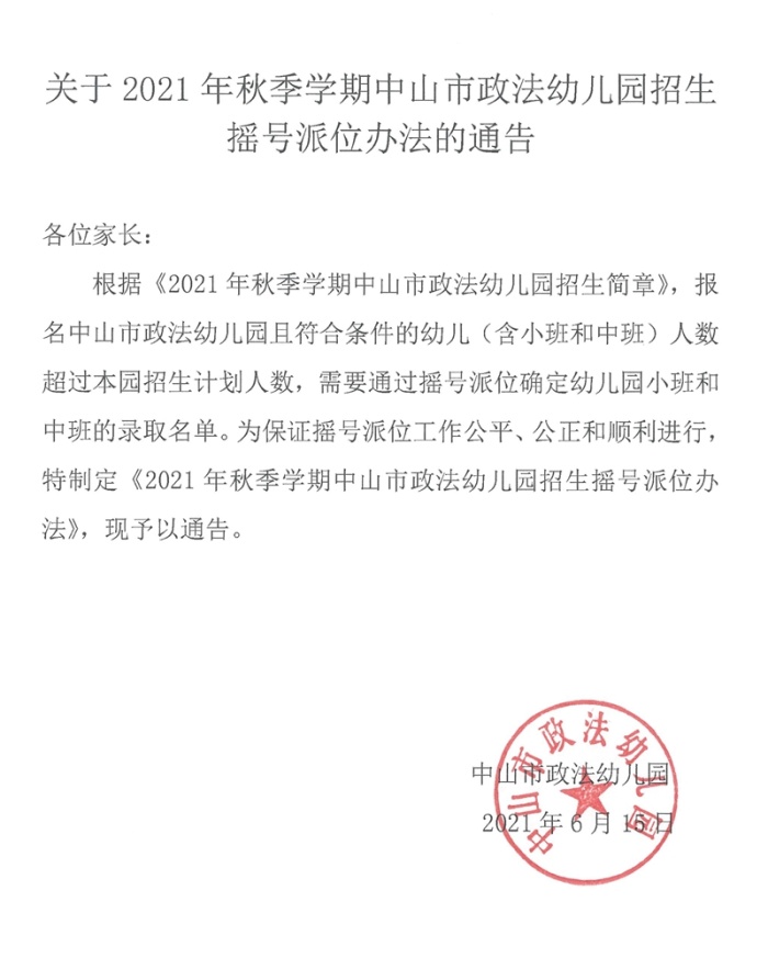 關于2021年秋季學期中山市政法幼兒園招生搖號派位辦法和派位數的通告