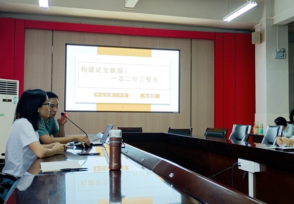 2022年5月19日下午,中山市第二中學寫作組開展第三次學習活動,由陳姍姍老師在校圖書館二樓會議室進行主題為《構建論文框架:一定二分三整合》的講座。陳姍姍老師從自己論文寫作經歷講起,強調不僅要閱讀專業書籍,更要把論文寫在課堂上,論文素材從教學實踐和反思中來,論文寫作學習從學會制定框架開始。這個專題指導為寫作組老師們指明了正確的論文寫作方向。