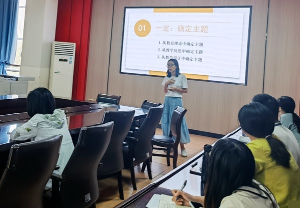 陳姍姍老師講到,要上好課,堅持寫教學反思,充分利用教學反思。教學在論文寫作中占據80%的重要性,因此,老師們要重視教學反思的寫作,通過教學反思寫透一個問題,從教學反思中提煉出論文。結合自己多篇已發表的教學論文,陳姍姍老師詳細講授了如何通過“一分二定三整合”制定論文框架,包括:確定論文主題,切分觀點的原則和策略,整合主題、觀點和素材的方法。