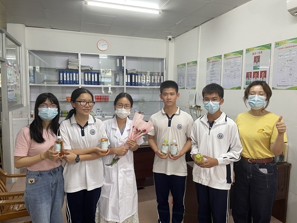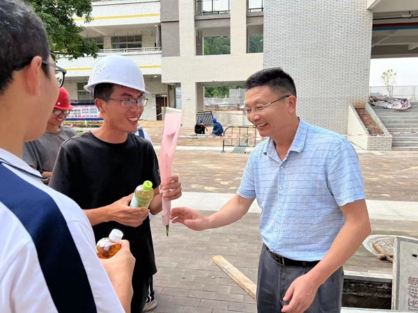 活動開始了!集合完畢,準(zhǔn)備出發(fā)。同學(xué)們分成幾個(gè)小隊(duì)來到校醫(yī)辦公室、門衛(wèi)室、校園建筑工地、宿舍辦公室,向所有的后勤老師及工作人員送上祝福。一朵花、一瓶水、一聲祝福,那代表著最真誠的感謝。吳祥明校長也與同學(xué)們一道,向辛勤的建筑工人們送上鮮花和飲品,代表同學(xué)們感謝他們的辛勤勞動。